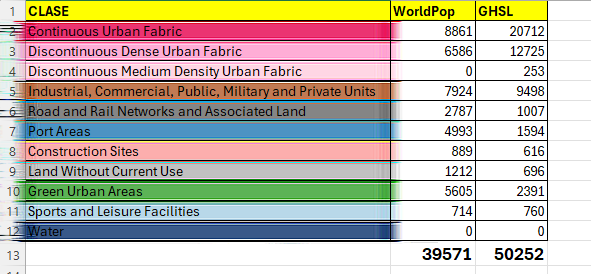 Las clases de uso del suelo se obtuvieron del Atlas Urbano Copernicus y se agruparon en categorías temáticas siguiendo la nomenclatura oficial del Atlas Urbano. El scrip de GEE saca directamente esta tabla en formato CSV.