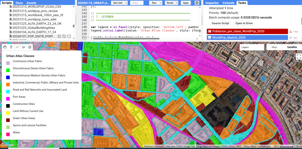 Este análisis representa un pequeño test rápido desarrollado por Alberto C (Geovisualization.net) para mostrar las potencialidades de uso de un asset externo en la plataforma Google Earth Engine (GEE) mediante JavaScript. Se trata de un mapa de usos del suelo (LULC / Clutter) de media-alta resolución que ofrece una precisión temática y espacial muy precisa (significativamente superior a la de Corine Land Cover) a lo que añadimos una estimación de población con una base de datos transnacional como WOLDPOP 100m y otra en paralelo GHSL 100m. Este flujo de trabajo, que integra capas externas con datasets globales de computación en la nube, se ha ejecutado íntegramente en unos pocos minutos, demostrando la agilidad operativa de las herramientas cloud actuales.