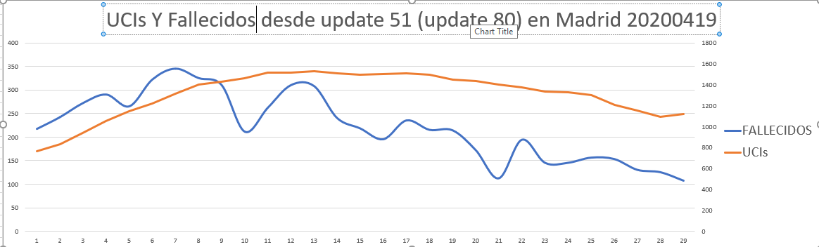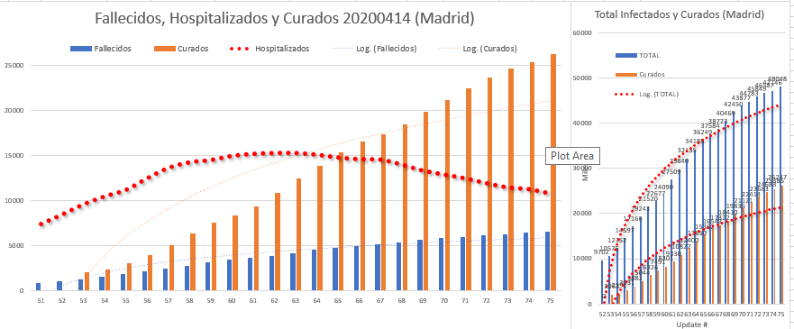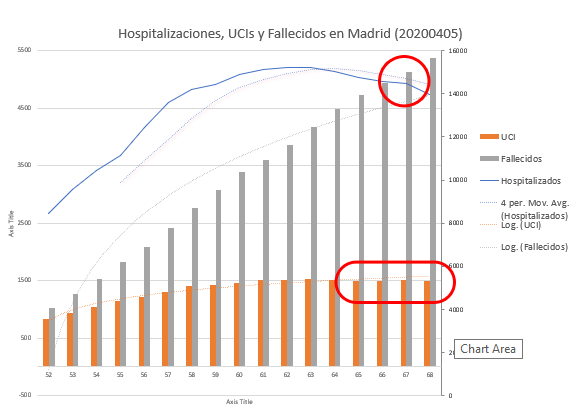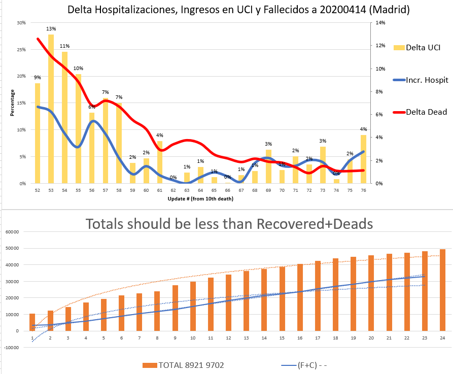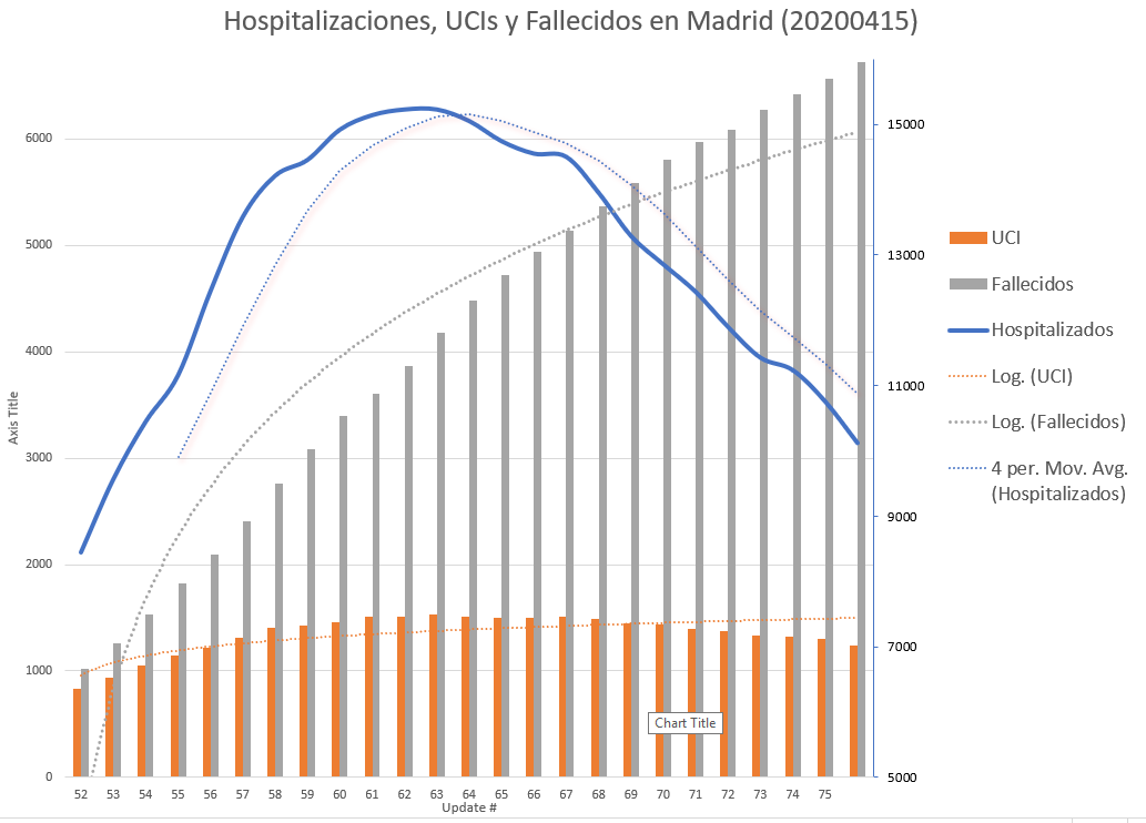Pero los muertos seguían subiendo. Una cosa buena es que tenía datos de capacidad máximas de estructuras, por ejemplo, en Madrid había en principio 1500 camas de UCI, cifras que fueron subiendo a medida que se iban inaugurando los centros de apoyo como los de IFEMA. El día 4 de Abril se llegó a una ocupación UCI de 1499. Qué miedo. Afortunadamente, todo bajó desde entonces.