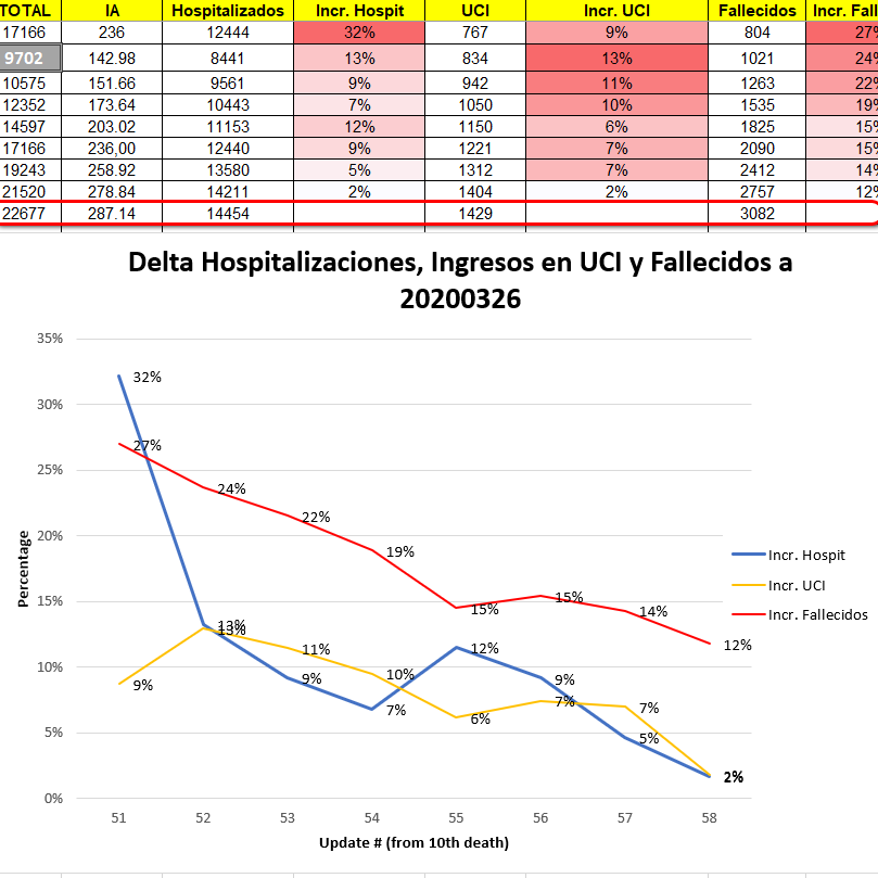 Luego pasaron los días y añadí los incrementos a la baja de las hospitalizaciones. Ahí estaban mis tres parámetros a la vez, bajando cual llaneros solitarios rodeados de muerte y abatimiento por todas partes. ¿Para qué vale esto? alguien dirá, pues para no perder el norte y darse cuenta que como decía Mark Twain “Hay tres clases de mentiras: las mentiras, las malditas mentiras y las estadísticas.”. Ahora en serio, bueno, yo quería creer que las cosas se iban a arreglar. Basta. :-).