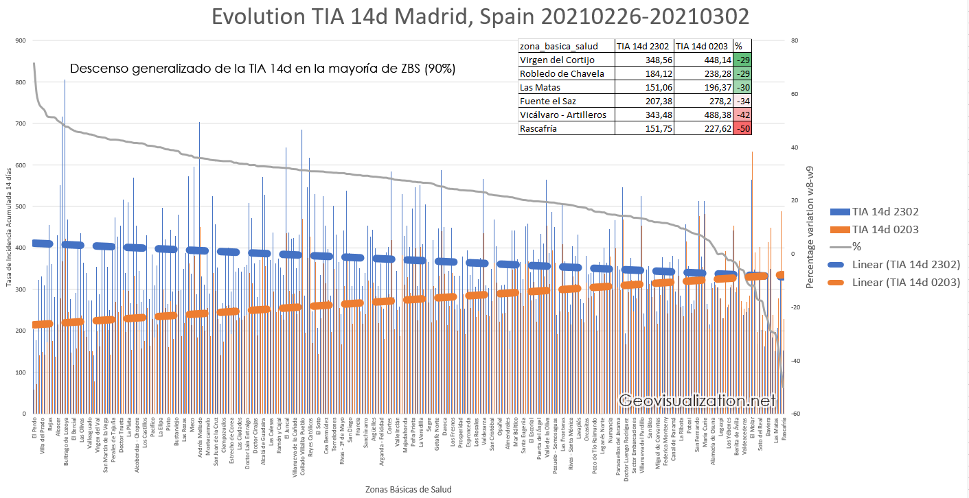 Afortunadamente la Tasa de Incidencia Acumulada por cada 100,000 habitantes baja en Madrid y eso que estamos entre las Comunidades Autónomas con peores datos (Solo mejor que Ceuta y Melilla mientras que en España estamos en 175,63). Me pregunto por qué todavía se plantean de cara a la Semana Santa si abrir la mano con las restricciones (no cerrar perimetralmente) cuando claramente las cifras están acompañando bien… De esta manera facilitamos una cuarta ola. ¡¡No debemos bajar la guardia!!
