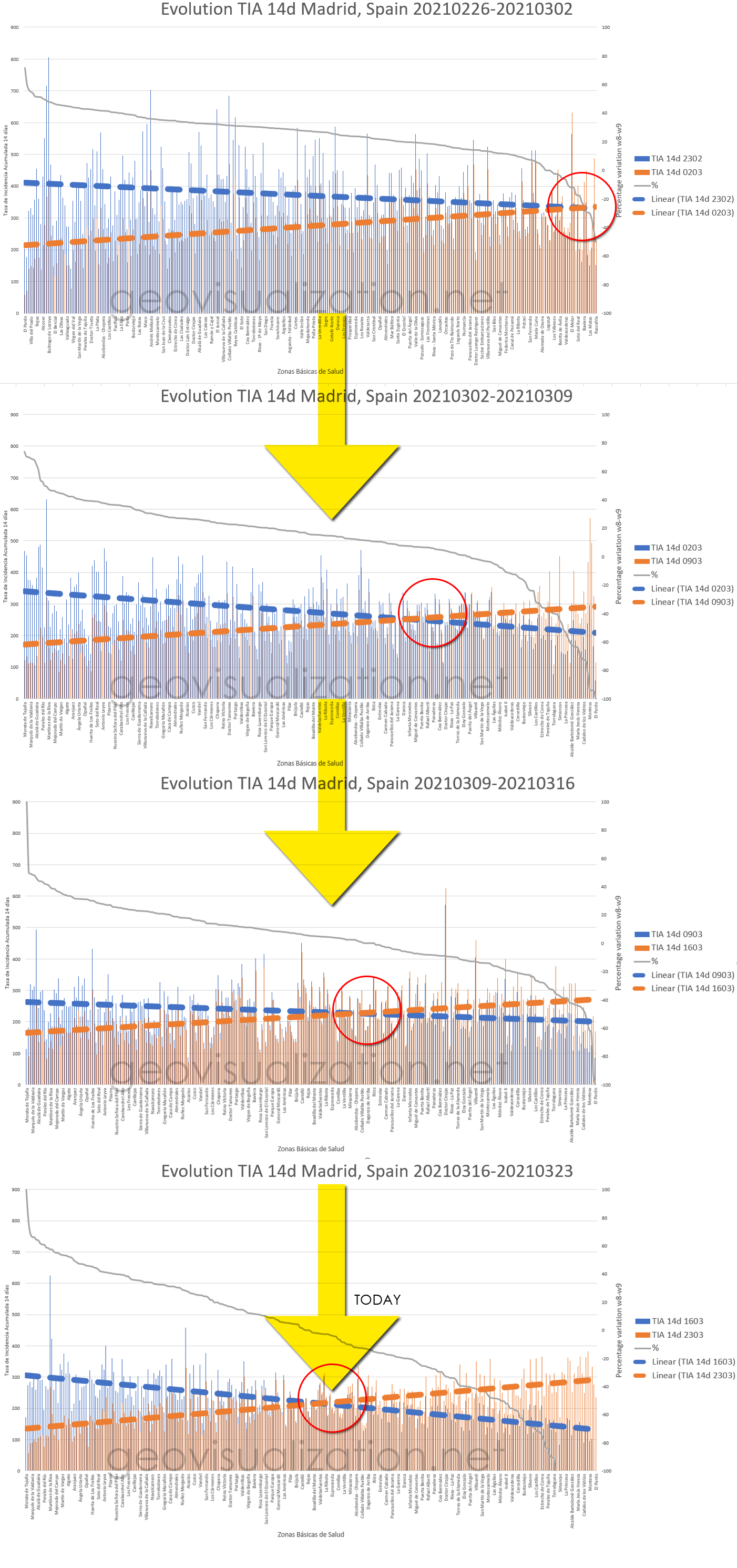 Comparando siempre la semana en curso con la anterior, midiendo las variaciones porcentuales y viendo hacia dónde vamos. Como se aprecia, cada vez hay más ZBS (Zonas Básicas de Salud) donde los datos de la semana presente son peores que los anteriores, lo que no pinta muy bien!.