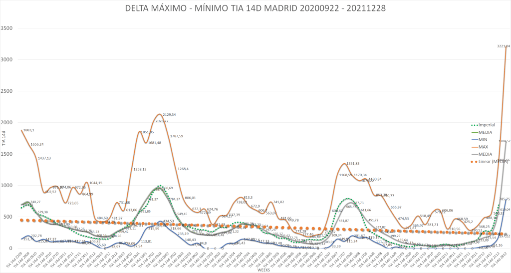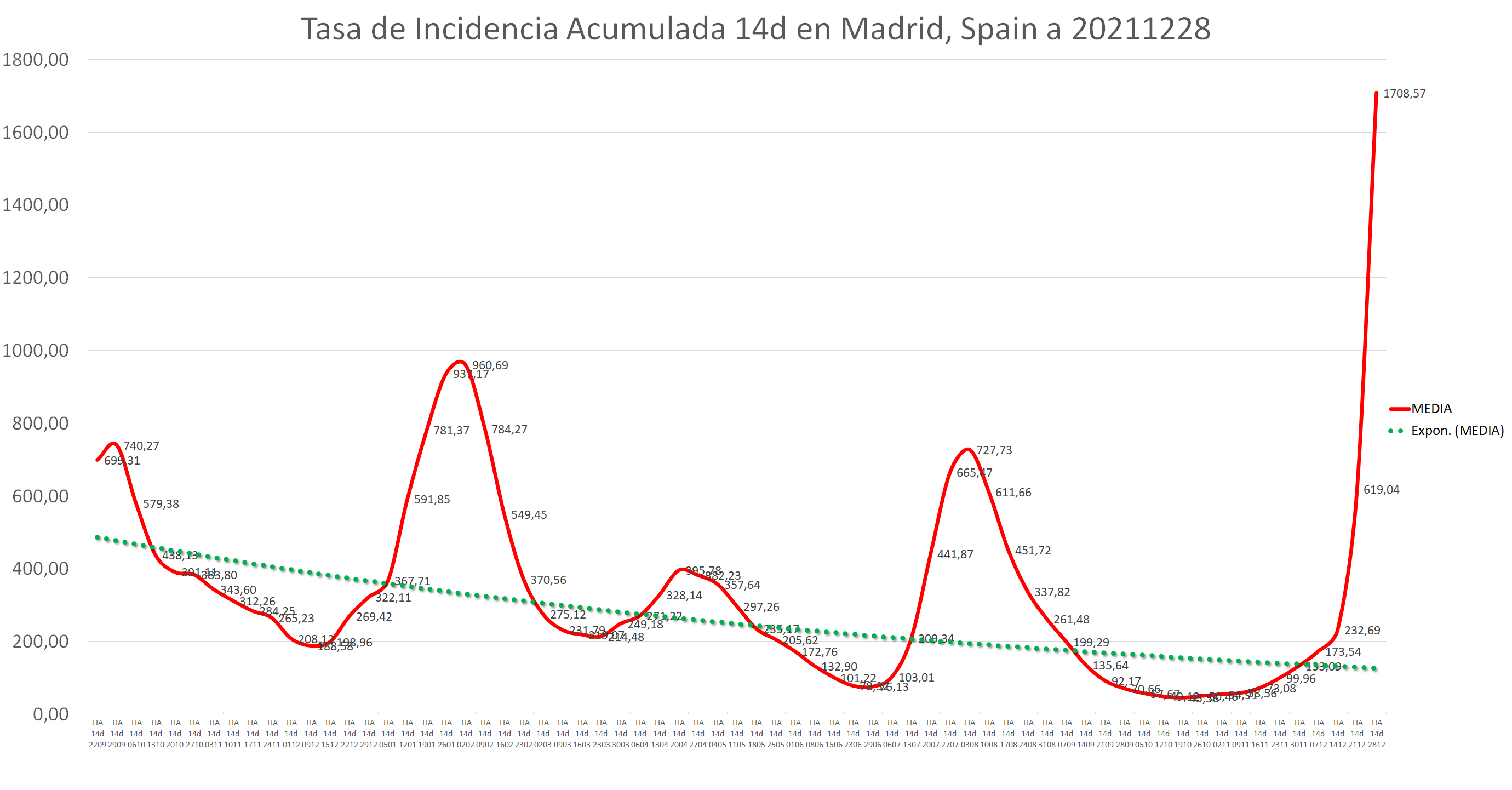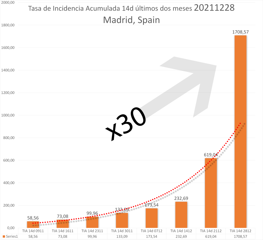 Cifras realmente alarmantes no porque estén generando un aumento de presión hospitalaria (menos mal!) sino porque son las cifras de contagios más altas desde el comienzo de la pandemia, hace unos 20 meses. Incluso un servidor se ha contagiado y escribe estas líneas desde el ostracismo de un aislamiento dolorosísimo en las peores fechas del año. Esta gráfica muestra cómo se llegan a multiplicar por treinta las incidencias en dos meses…