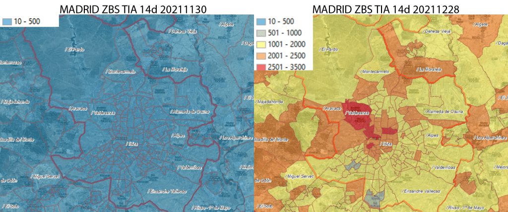 Como se puede ver, en un mes hemos pasado de ningún ZBS (Zonas Básicas de Salud) por encima de 500 a todos prácticamente por encima de esa cifra.