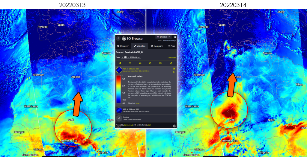 De repente se levanta uno y ve los coches, los marcos de las ventanas y las aceras llenos de arena… ¿Qué es esto?, ¡Uno quiere comprender más en detalle! Si esto es en Madrid, qué no ocurrirá en Murcia (que está de camino)!! 🙂 Lo cierto es que si tomamos las imágenes del SENTINEL 5P Aerosol index podemos ver cómo en esa longitud de onda encontramos aerosoles. ¡Y muchos! ¿Y hacia dónde se desplazan?. Directos al centro de la península.