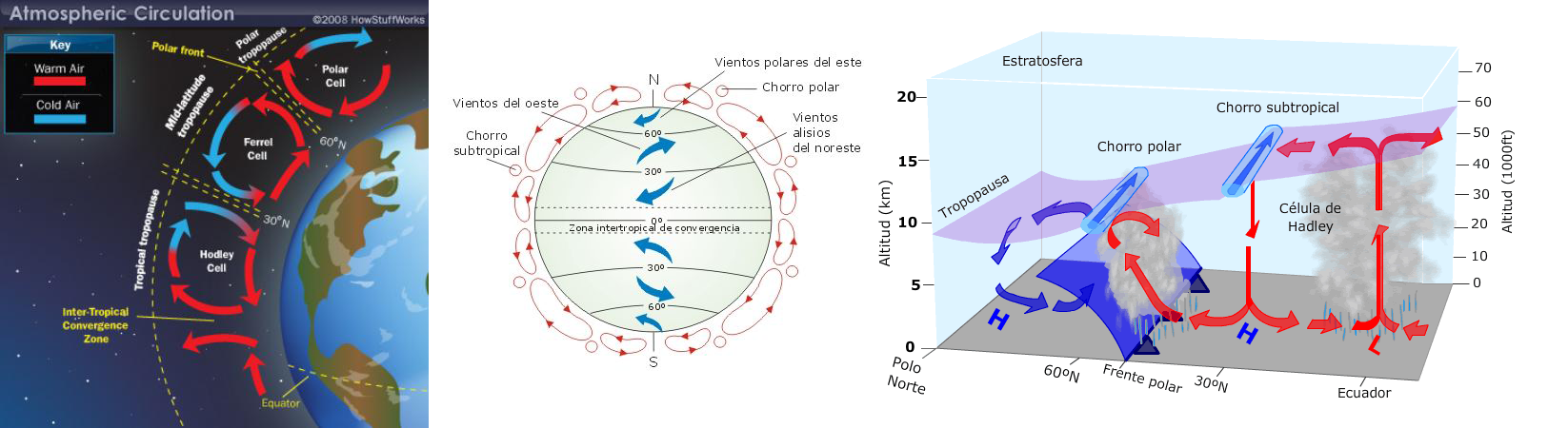 En esta imagen muestro lo mejor que se puede esta circulación general atmosférica. No es fácil de entender pero son algo así como unas células que varian de altitud y latitud (¿Podemos imaginar esto en 3D?) y que siempre tienen un mismo comportamiento (o casi). Las células cambian de latitud ligeramente así como de altitud, influenciadas por multitud de factores como la temperatura y humedad de las zonas que recorre.
