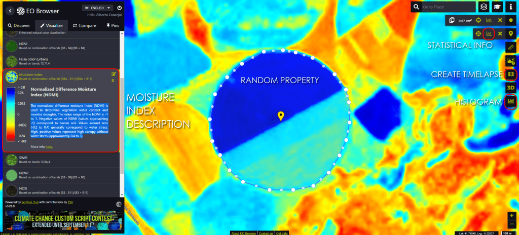 I am here in front of my desktop and I wonder how to take advantage of Sentinel Hub for tracking up moisture in a random plot anywhere in the world. Has it been irrigated at the right time for the type of crop? How has rainfall been affected over the analysis time? How has the use of certain fertilisers affected it? Has it positively affected production?. Let’s take a closer look.