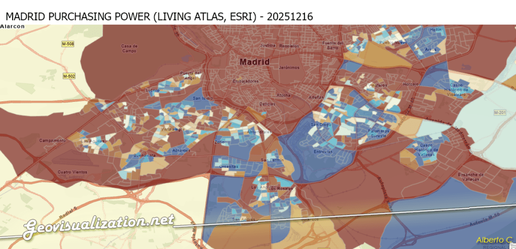 An official census of commercial premises provided by the City of Madrid, including the geolocated inventory of gambling-related establishments (e.g., betting shops, gaming halls). For analytical purposes, individual point locations were spatially aggregated to census sections, generating a count of Gambling Stores per census section. (–>Figura 3) - Purchasing Power Index (INE, 2022, extracted from ESRI’s LIVING ATLAS):