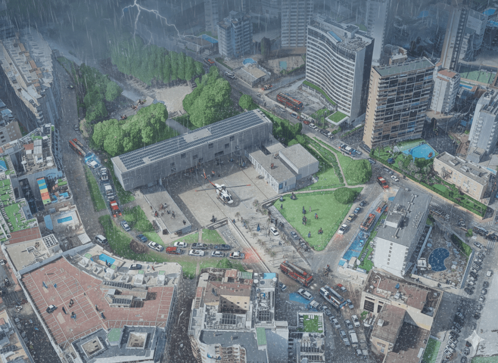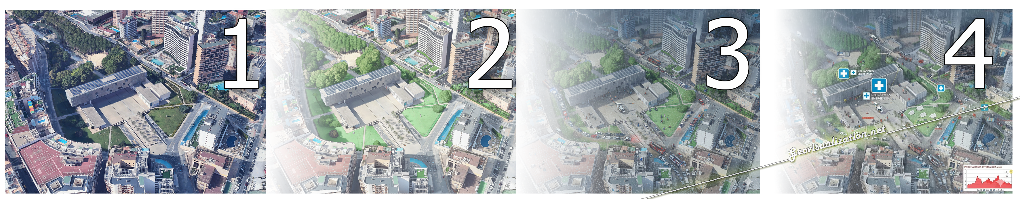 Luego, imaginando una situación en la que varios layers fueran necesarios, he tratado de integrar algunas capas como POIs o modelos 3D realistas como helicopteros, tiendas de campaña de emergencias, coches colapsados, etc