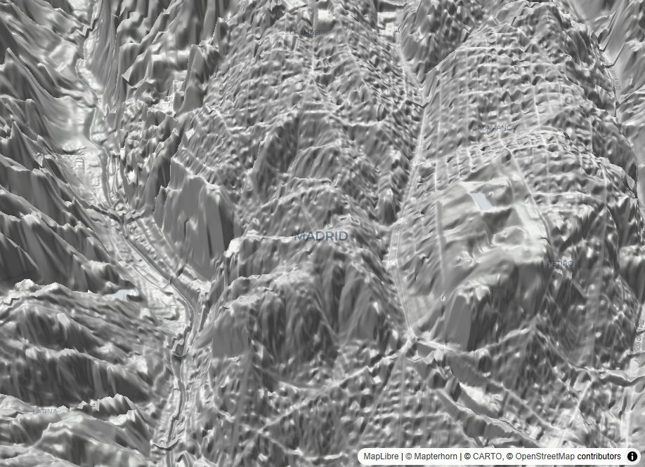 install.packages(c("mapgl", "terra", "elevatr", "sf", "tidyterra", "ggplot2"))---------------------------------library(mapgl)library(terra)library(elevatr)library(sf)maplibre( style = carto_style("voyager"), center = c(-3.703, 40.416), zoom = 14, pitch = 40) |> add_raster_dem_source( id = "mapterhorn_pro", url = "pmtiles://https://download.mapterhorn.com/planet.pmtiles", tileSize = 512, encoding = "terrarium" ) |> set_terrain(source = "mapterhorn_pro", exaggeration = 0.1) |> add_layer( id = "sombras", type = "hillshade", source = "mapterhorn_pro", paint = list( "hillshade-exaggeration" = 0.5, "hillshade-shadow-color" = "#333333", "hillshade-illumination-direction" = 315 ) )