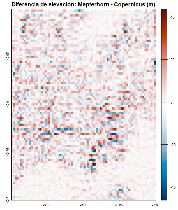 Por tanto, el RMSE que calculamos no mide únicamente el error de Copernicus — mide la diferencia acumulada entre dos modelos distintos, que incluye diferencias reales de resolución, diferencias metodológicas y el efecto de la vegetación sobre el radar. En zonas boscosas como la sierra de Guadarrama, estas diferencias pueden ser especialmente pronunciadas, llegando a varios metros en las áreas más densamente arboladas.