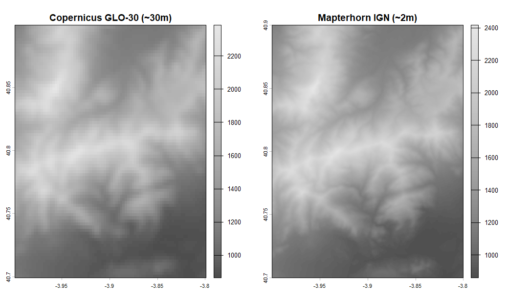 library(elevatr)library(terra)library(ggplot2)# 1. Zona y descarga de ambos MDTspuntos <- data.frame(x = c(-4.0, -3.8), y = c(40.7, 40.9))dem_low <- rast(get_elev_raster(puntos, z = 8, prj = "EPSG:4326", clip = "bbox"))dem_high <- rast(get_elev_raster(puntos, z = 14, prj = "EPSG:4326", clip = "bbox"))# 2. Perfil de elevación (path profile) a lo largo de una transectapasos <- 200lon_seq <- seq(-4.0, -3.8, length.out = pasos)lat_seq <- seq(40.7, 40.9, length.out = pasos)coords <- cbind(lon_seq, lat_seq)z_low <- extract(dem_low, coords)[, 1]z_high <- extract(dem_high, coords)[, 1]dist_m <- seq(0, 25000, length.out = pasos) # ~25km de transecta# 3. Path profile comparativoperfil_df <- data.frame( distancia = rep(dist_m, 2), elevacion = c(z_low, z_high), fuente = rep(c("Copernicus GLO-30 (~30m)", "Mapterhorn IGN (~2m)"), each = pasos))ggplot(perfil_df, aes(x = distancia / 1000, y = elevacion, color = fuente)) + geom_line(linewidth = 0.8, alpha = 0.85) + scale_color_manual(values = c("Copernicus GLO-30 (~30m)" = "#e74c3c", "Mapterhorn IGN (~2m)" = "#2c3e50")) + labs( title = "Perfil de elevación: Copernicus vs Mapterhorn", subtitle = "Transecta SW-NE sobre la Sierra de Guadarrama", x = "Distancia (km)", y = "Altitud (m)", color = NULL ) + theme_minimal(base_size = 13) + theme(legend.position = "top")# 4. RMSE — remuestrea el MDT de alta res a la resolución del bajodem_high_resampled <- resample(dem_high, dem_low, method = "bilinear")z_low_full <- values(dem_low)z_high_full <- values(dem_high_resampled)# Elimina NAsidx <- complete.cases(z_low_full, z_high_full)rmse <- sqrt(mean((z_high_full[idx] - z_low_full[idx])^2))cat(sprintf("RMSE entre Copernicus GLO-30 y Mapterhorn IGN: %.2f metros\n", rmse))# 5. Diferencia espacial (mapa de error)diff_raster <- dem_high_resampled - dem_lowplot(diff_raster, main = "Diferencia de elevación: Mapterhorn - Copernicus (m)", col = hcl.colors(100, "RdBu", rev = TRUE))