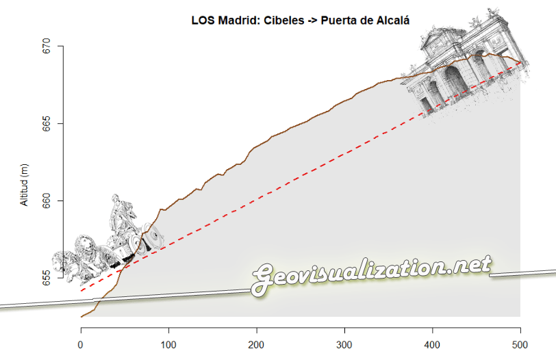 El resultado es claro: el terreno queda por encima de la línea de visión en todo el trayecto, lo que indica que el suelo sube progresivamente desde Cibeles hacia Alcalá. Curiosamente, aunque ambos monumentos son perfectamente visibles entre sí en la realidad (la calle es recta y despejada), el propio desnivel del terreno hace que la línea de visión rasante quede por debajo del suelo si no se tienen en cuenta los edificios ni la altura real de los monumentos.