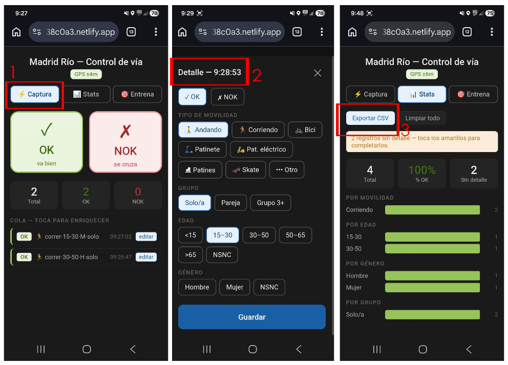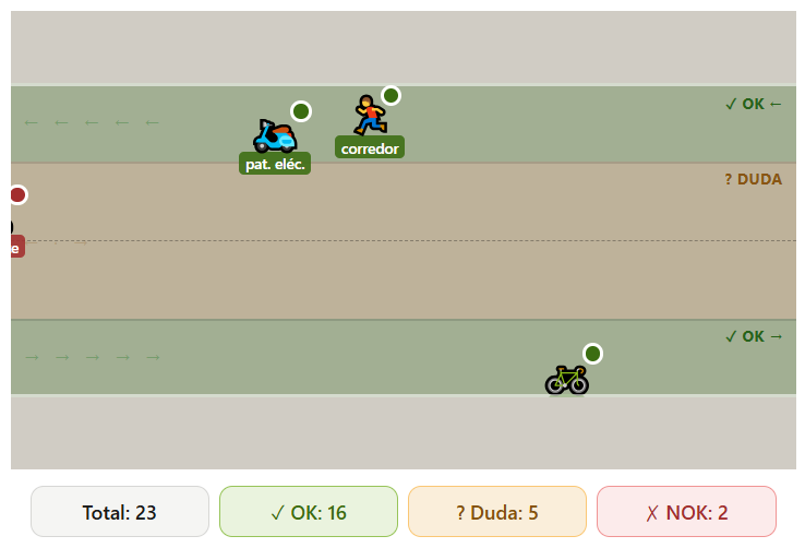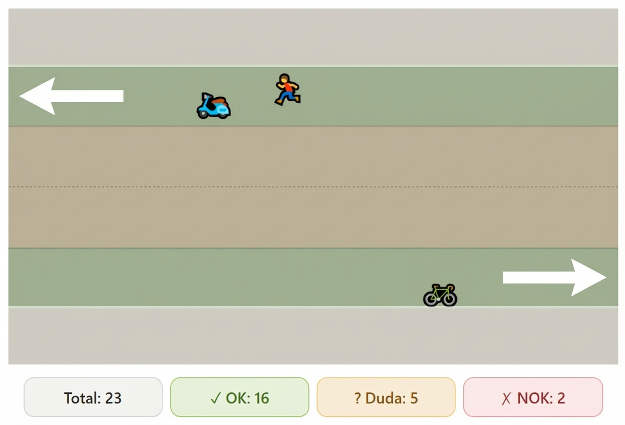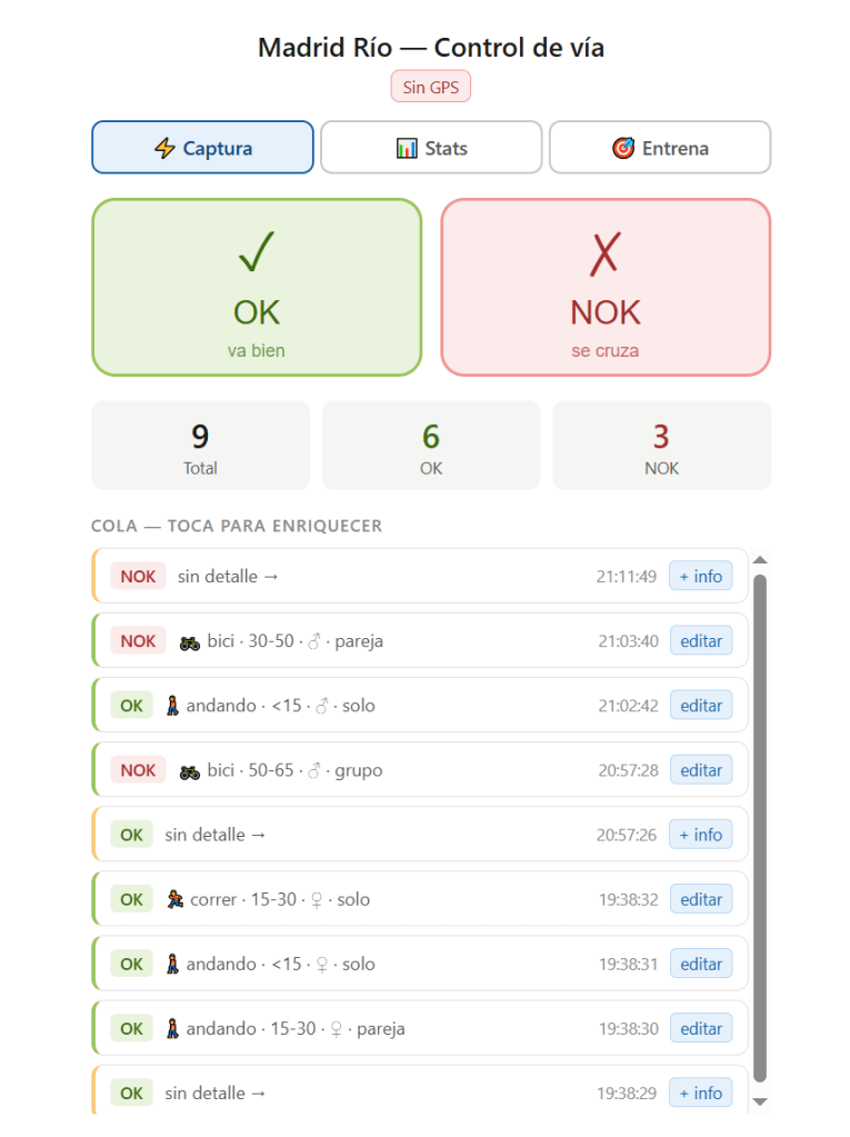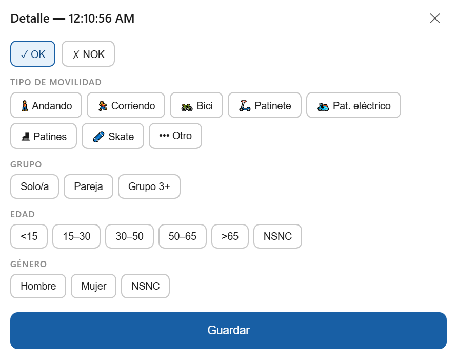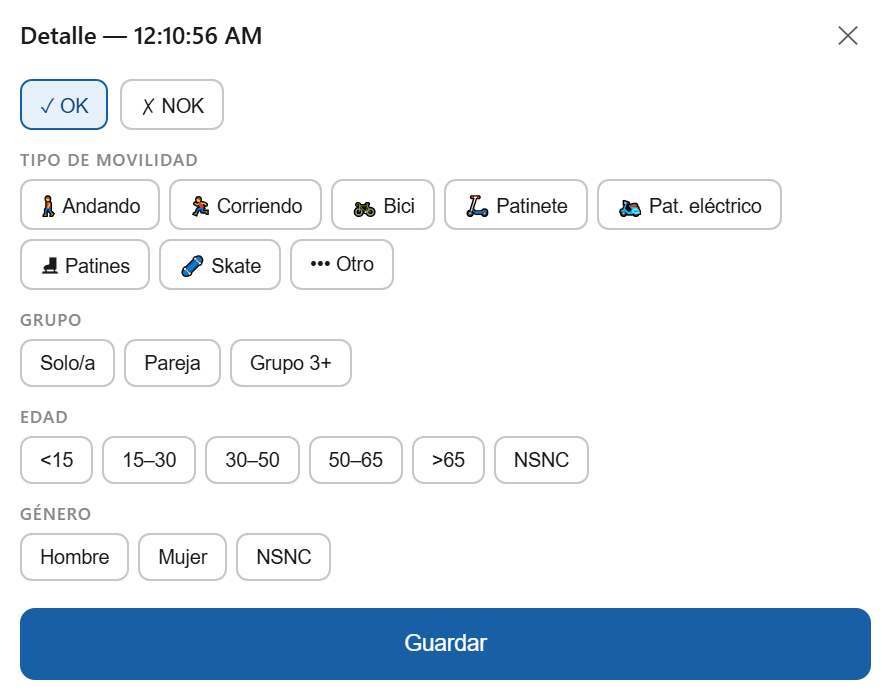 Tienes aproximadamente un segundo. A veces menos, por eso la herramienta de captura está diseñada en dos tiempos. En el primero, solo hay dos botones: OK o NOK. Nada más. Sin pensar en si es hombre o mujer, sin estimar la edad, sin identificar si va en patinete o en patín eléctrico. Solo: ¿va por donde debe o no? Un toque y listo. El registro queda guardado con timestamp y coordenadas GPS.