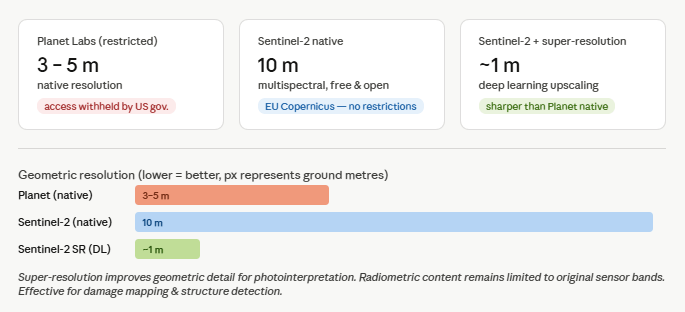 But the real game-changer is super-resolution. Applying deep learning models to Sentinel-2 data can produce outputs approaching 1-metre effective resolution — sharper than Planet’s native 3–5 m commercial imagery, and entirely outside the reach of any US export control or NOAA licensing mechanism. Copernicus data is free, open, and governed by the European Union, not by an administration that has a direct interest in what gets seen.