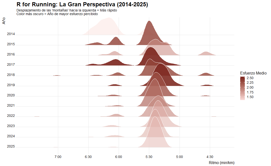 Un registro constante: más de 11 años (desde Agosto 2014 hasta hoy) con más de 1,150 sesiones documentadas. Un proyecto vital; no son solo números, es la cronología de mi disciplina. Puedo decir de nuevo que R me ha roto mis esquemas de geógrafo de ArcGIS, de Global Mapper y QGIS, ahora no todo pasa por el filtro de tener coordenadas, por ejemplo estos insights no tienen coordenadas pero son analizables y se pueden tomar conclusiones que te permiten tomar decisiones rápidas… Echemos un vistazo a mis carreras los últimos años.