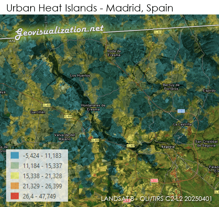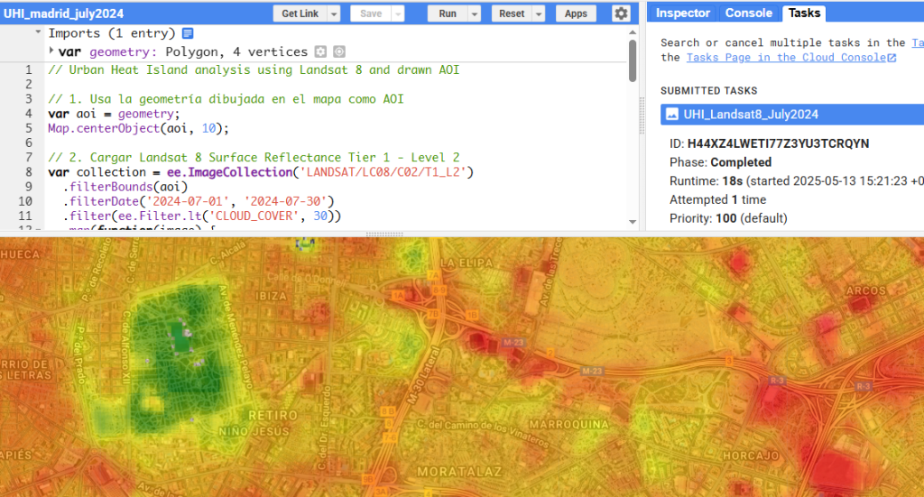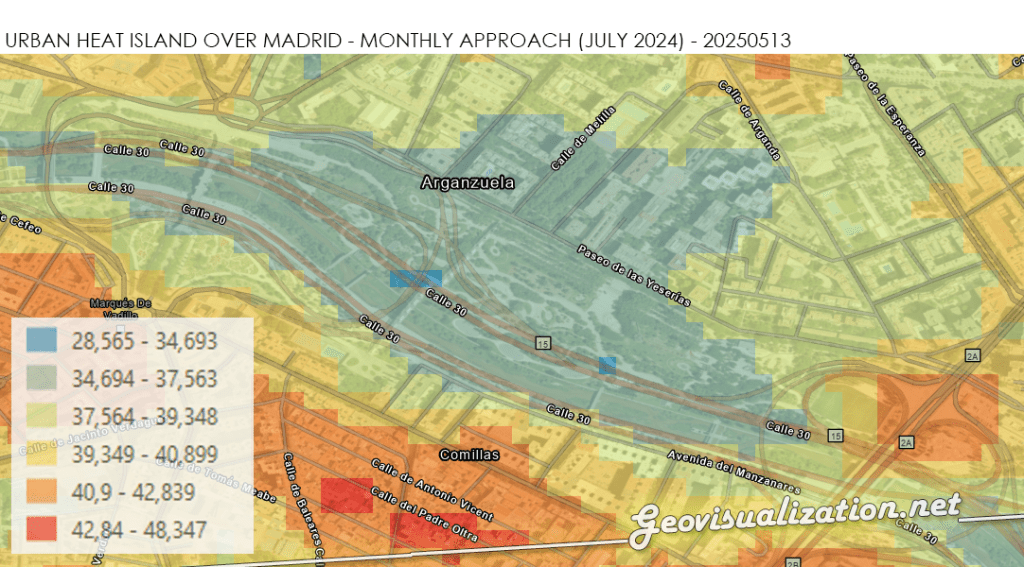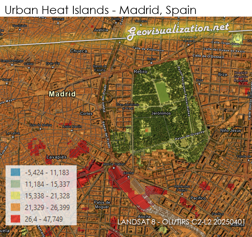Between June 21 and September 21, 2024, I analyzed the surface temperatures of all 2,123 registered playgrounds in Madrid using Landsat 8/9 imagery (Level-2 Surface Temperature products). This investigation, an extension of my previous reflection on urban heat and environmental justice in Geovisualization.net (May 2025), highlights how thermal exposure is patterned by geography, planning legacies, and demographic vulnerability in the Spanish capital.