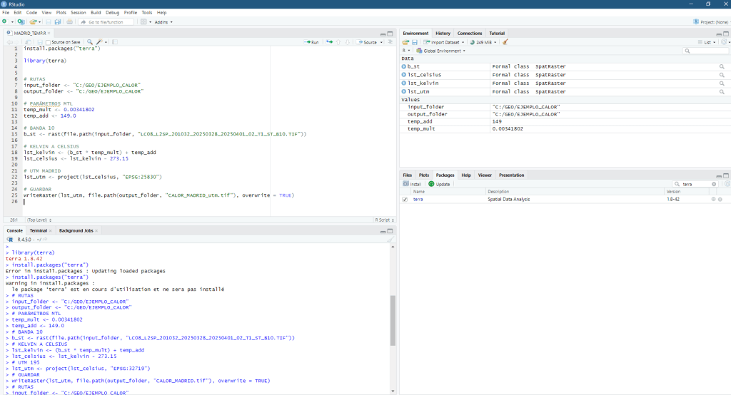 The procedure (1) Single (one day) approach. This is the code for R Studio I extracted from TAMYGEO’s video and adapted to my needs over Madrid, first thing using ChatGPT for extracting text from a video capture, second thing, once I had verified proper installation of R Studio, installing terra package (one of the Spatial Data Analysis in R):