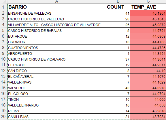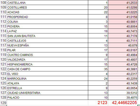 In contrast, peripheral neighborhoods such as Ensanche de Vallecas and Villaverde not only host a large number of playgrounds (41 and 26 respectively), but also recorded some of the highest mean surface temperatures in our entire dataset—exceeding 45 °C in many cases, with peaks around 46.2 °C.