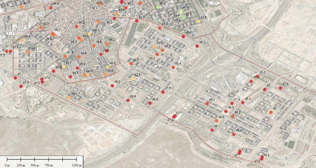 In the opposite side, playgrounds in the northern and northwestern parts of the city consistently recorded significantly lower surface temperatures. Areas such as Ciudad Universitaria (39.5 °C), El Viso (40.2 °C), Nueva España (40.6 °C), and Valdemarín (41.7 °C) benefit from a combination of urban tree cover, proximity to institutional campuses or forested parkland, and lower built density. The result is a materially cooler outdoor environment for children. In these districts, playgrounds function as thermally moderated, socially accessible urban commons—something far from guaranteed in their southern counterparts.
