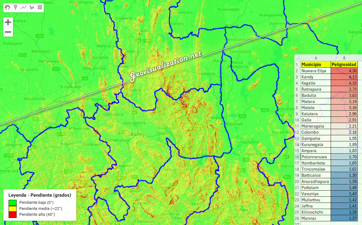 Peligrosidad de acuerdo a las pendientes usando SRTM como fuente del DTM. Sri Lanka.GEE Interface and attribute table (including “peligrosidad” figures) to be exported as CSV