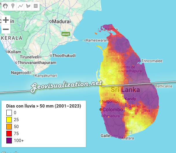 Gracias a datos satelitales de alta calidad y herramientas de análisis geoespacial en la nube, es posible generar de forma ágil mapas de peligrosidad climática con respaldo científico y cobertura global. Un primer ejemplo de ello es el análisis de la frecuencia de lluvias extremas realizado para Sri Lanka en el periodo 2001–2023.