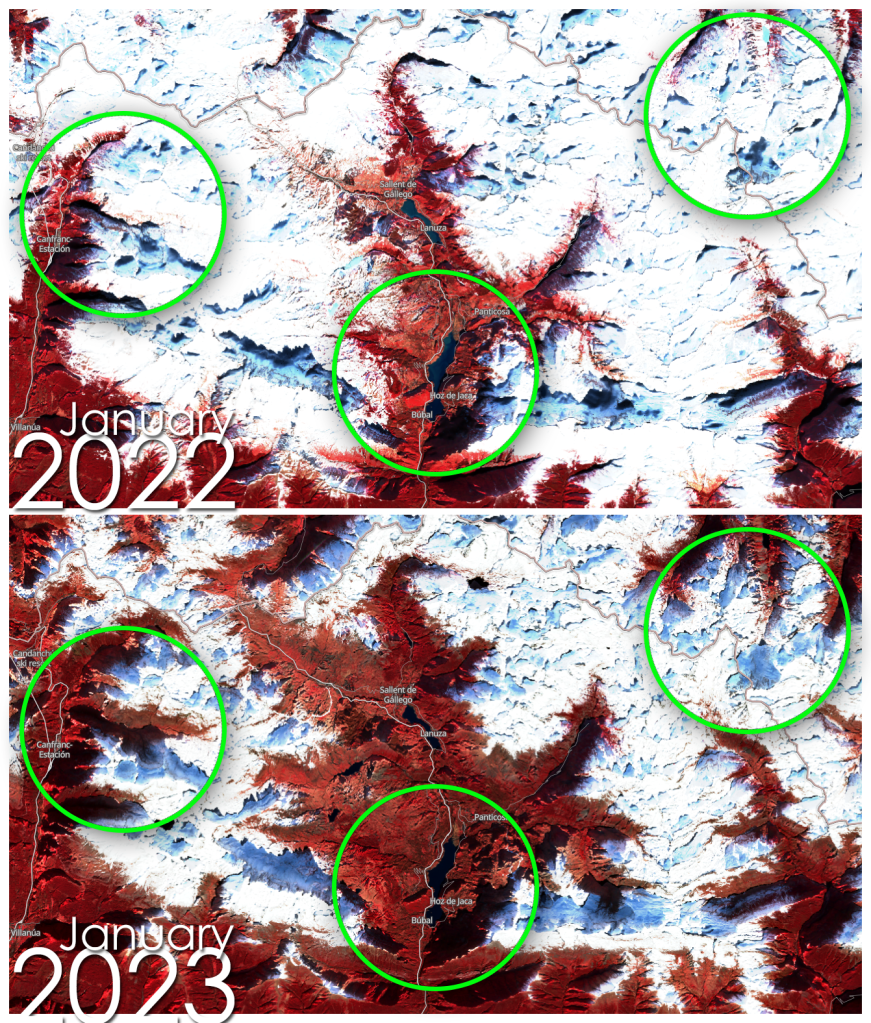 Playing with Sentinel 2 images I realized that the amount of snow this year has been very low compared to last winter. Here are a couple of images from January 2022 and 2023 of the Canfranc – Paticosa – Jaca area.